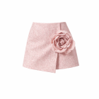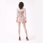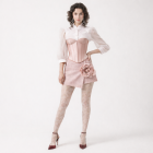 This romantic, couture-inspired ensemble blends delicate femininity with structured tailoring. A sculpted blush corset is layered over a sheer high-neck blouse with soft puff sleeves and delicate front buttons, creating an elegant balance of structure and lightness. The look is completed with a textured soft pink mini skirt featuring a dramatic oversized fabric rose at the hip. Paired with lace-patterned tights, the ensemble highlights the waist while maintaining a refined, vintage-inspired aesthetic.