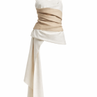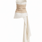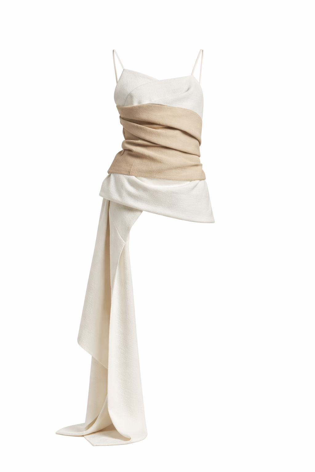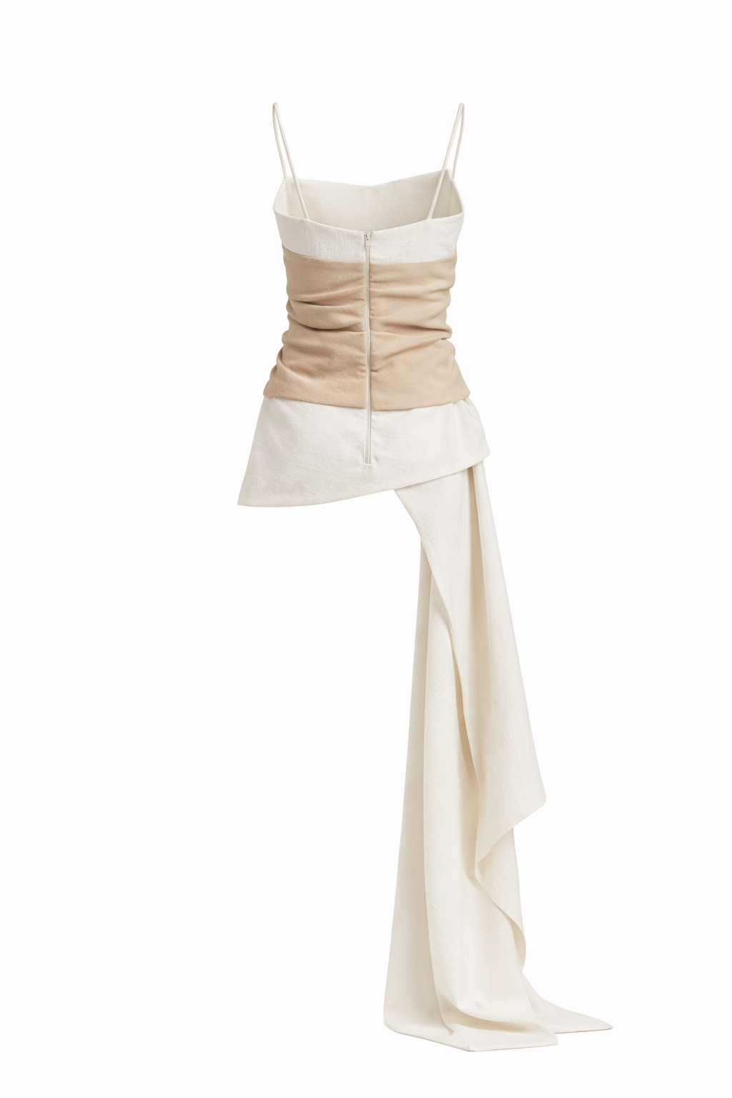 This modern, sculptural ensemble blends refined minimalism with elegant movement. Designed in warm sand and soft ivory tones, the look features a sleek camisole-style bodice with delicate spaghetti straps and a softly contoured neckline that highlights the shoulders and collarbone. A structured wrap panel defines the waist, while a flowing draped element cascades from the hip, creating a graceful, train-like effect that moves beautifully with each step. The design is paired with tailored high-waisted trousers in a slim, elongated silhouette with a subtle flare at the hem. The contrast between the sharp tailoring and fluid draping creates a sophisticated balance of structure and softness, resulting in a contemporary statement piece perfect for elegant occasions.
