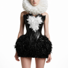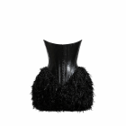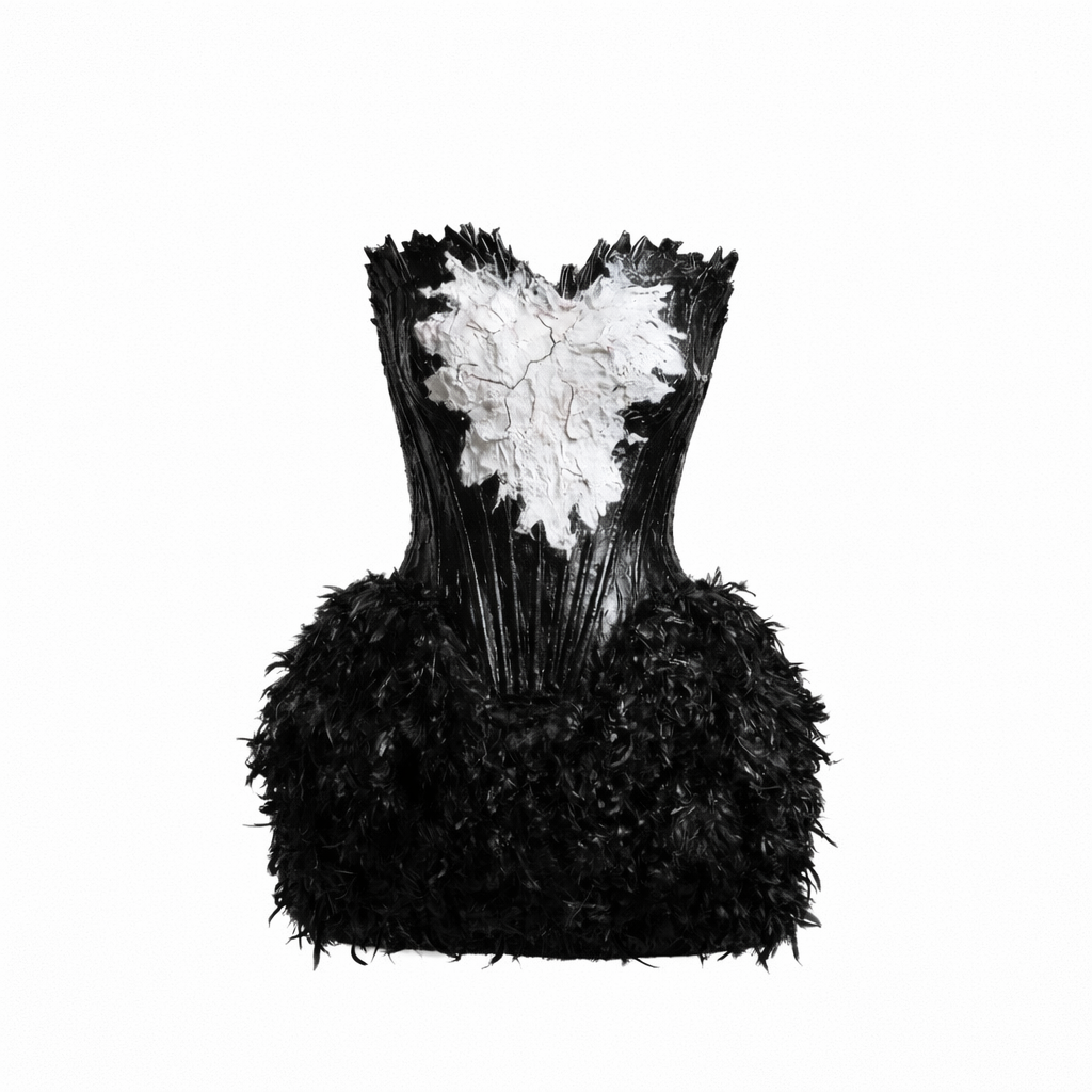 Make a bold statement with the Midnight Feather Corset Mini Dress, a striking piece that blends sculptural elegance with modern couture design. This captivating dress features a structured black corset bodice adorned with an artistic white textured centerpiece that creates a dramatic contrast and highlights the silhouette. The fitted bodice shapes and supports the waist, while the voluminous feathered skirt adds movement, texture, and high-fashion drama. Designed for special occasions, fashion events, or upscale evening wear, this piece delivers a runway-inspired look that commands attention.